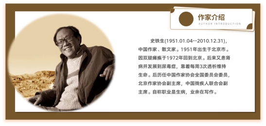 史铁生是一个生命的奇迹,在漫长的轮椅生涯里至强至尊,一座文学的高峰,其想象力和思辨力一再刷新当代精神的高度,一种千万人心痛的温暖,让人们在瞬息中触摸永恒,在微粒中进入广远,在艰难和痛苦中却打心眼里宽厚地微笑。