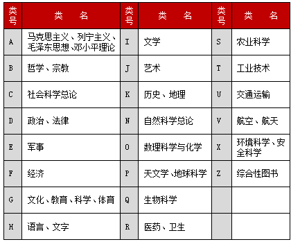 图书馆使用的是《中国图书馆分类法(第五版)》对图书进行分类,它是在科学分类的基础上,结合图书的特性所编制的分类法。它将学科分五大类,二十二大部类。五大类为:马列毛思想、哲学、社会科学、自然科学、综合性图书;二十二个基本大类为马列毛邓思想、哲学宗教、社会科学、政治法律、军事、经济、文化教育、语言和文字、文学、艺术、历史地理、自然科学、数理化、天文学和地球科学、生物科学、医药和卫生、农业科学、工业技术、交通运输、航空和航天、环境科学和安全科学、综合性图书。每个基本大类分别用一个汉语拼音字母表示,每一类又细分若干小类。