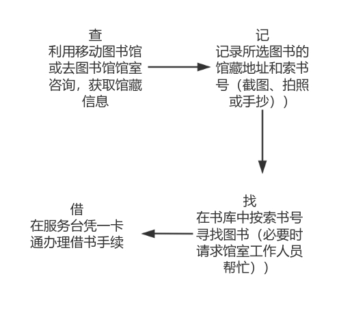 读者在进入书库前,需将个人图书、笔记本电脑、食物等物品存入门口的存包柜中,禁止携带入内。读者需刷移动校园一卡通进入书库,借书流程如下图所示: