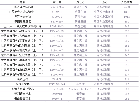 值得一提的是,今年借阅排名靠前的书单中,军事类(E类)的图书像猎狗编队一样异军突起,《世界军事百科丛书》包括战争元凶、古代军事、军事枭雄等十种图书借阅量增长显著,占据排行榜的一半篇幅,借阅次数都达到了二百余次,可见齐齐哈尔工程学院众多工科学子学习军事类图书的兴趣愈来愈强烈。另外,关于K类和I类图书依然活跃在排行榜中,语言艺术类图书此次挤进前二十,也有一百五十余次的借阅量。读者们保持对历史、地理及文学的热爱,军事和语言艺术等方面的兴趣也越来越强烈。